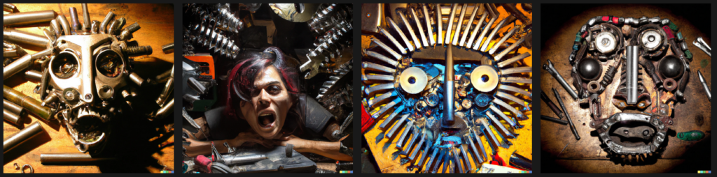Similarly, the prompt below, which calls for a ‘human face… made from mechanical tools’, now gets a random ‘demographic person’ of attached in the second output: